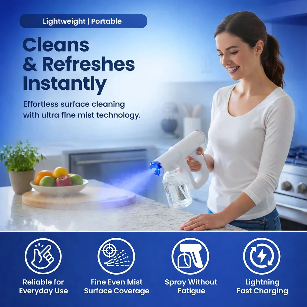 A precision nano mist system designed to deliver ultra-fine, even coverage in seconds without effort or hand fatigue.